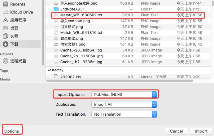 步骤三、在endnote导入第二步下载的文件,导入的时候务必注意选择导入格式为“PubMed(NLM)”,然后点击导入即可。导入过程后如下所示: