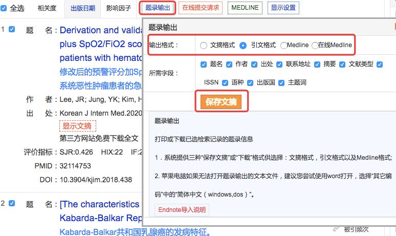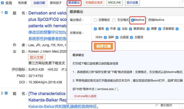 步骤二、点击“题录输出”,选择“输出格式”为“Medline”,点击“保存文摘”即可。如下图所示:
