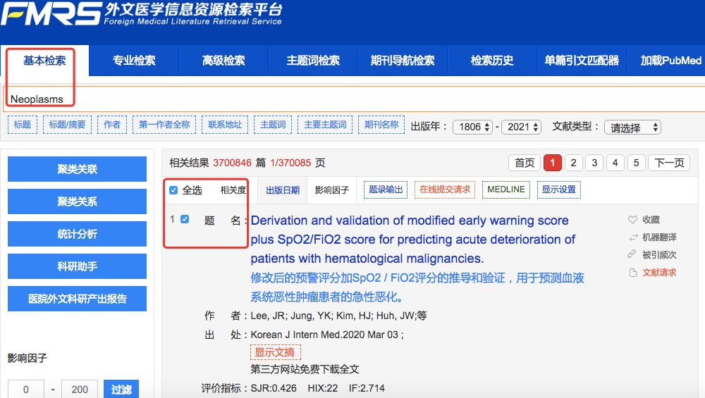 外文医学信息资源检索平台(Foreign Medical Literature Retrieval Service),简称FMRS,该数据库目前可以用中英文关键词、主题词一站式检索31799种期刊文献,文献题录数据量3千多万条。FMRS对检索结果能够进行大数据统计分析、聚类关联、中英文对照翻译、文献质量评价等。