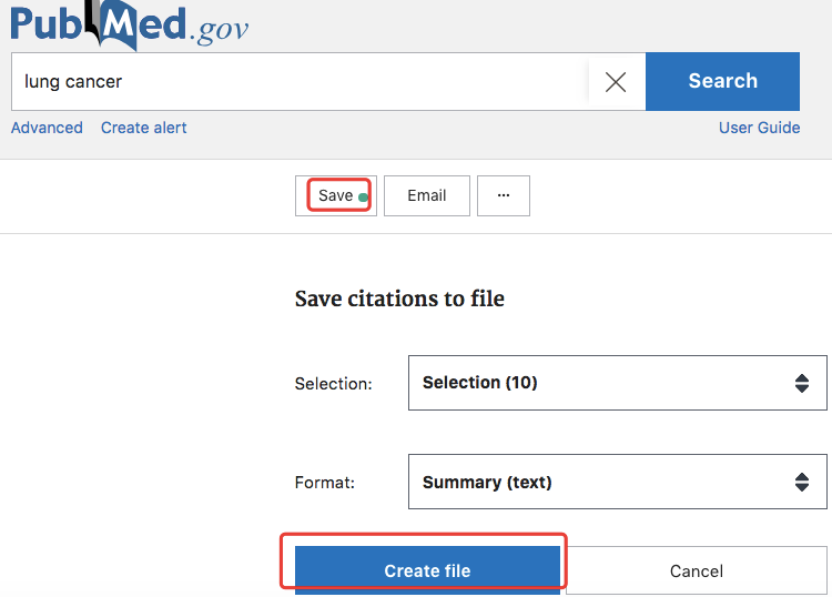 第一步:在PubMed数据库中检索“lung cancer”,得到342209篇文献,在文献标题前面勾选需要导入FMRS数据库的文献,点击“save”,保存文献到本地。如下图所示: