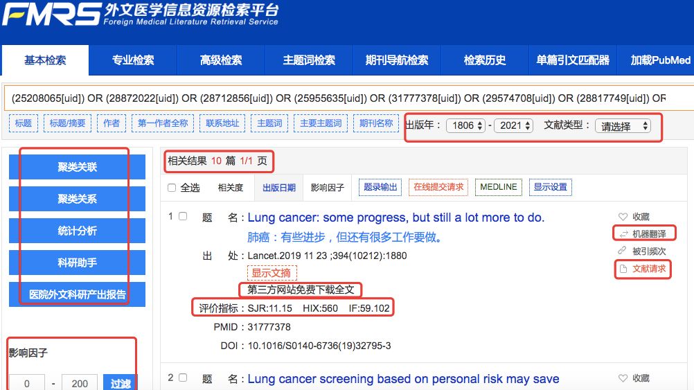 第三步、将PubMed数据库选中的10篇文献导入FMRS数据库后情况如下所示,我们可以很方便的对这些文献进行大数据统计(可以对成百上千篇文献进行聚类关联、统计分析,发现研究热点、行业大咖、重点研究机构、课题研究趋势、相关疾病、药物、诊断方法和治疗方法等),可以快速评价文献质量(影响因子、威望指数、H指数评价等),可以对文献标题和摘要进行翻译和PDF全文翻译,可以通过“文献请求”或者“第三方网站免费下载全文”等通道获取全文,也可以对文献进行时间过滤、文献类型过滤等等。