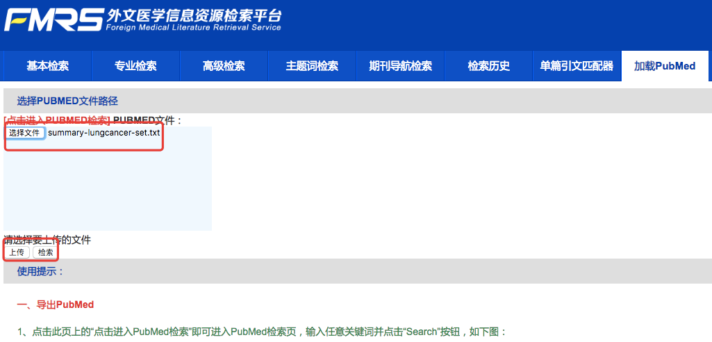 第二步:在FMRS数据库中点击“加载PubMed”,点击“选择文件”,在本地电脑中选择第一步保存的文件,点击“上传”按钮,上传完成后点击“检索” 按钮,如下图所示: