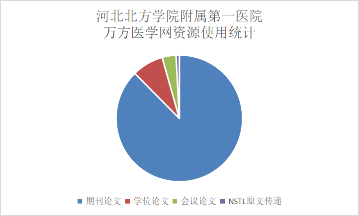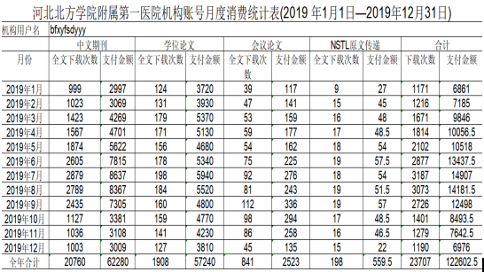 2、万方医学网:医学类专业知识服务平台涵盖了期刊论文/学位论/会议论文/原文传递等;主要资源2019年使用情况如下表: